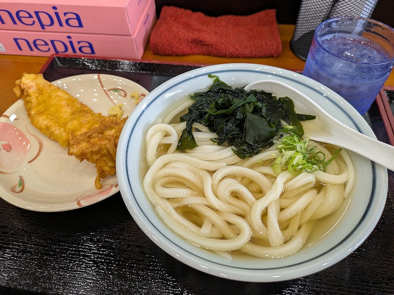 ○ 温かいかけうどん(小)+とり天(カレー味)(奥さま)