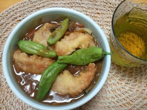 海老天(惣菜150円)とししとうをのっけたカレーうどん。カレーにはめんつゆを少し入れて薄めてます。