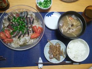 豚汁は、豚が多めで満足度が高いです。きんぴらはいつもどおりGood。今日はヘルシー晩ごはんでした。