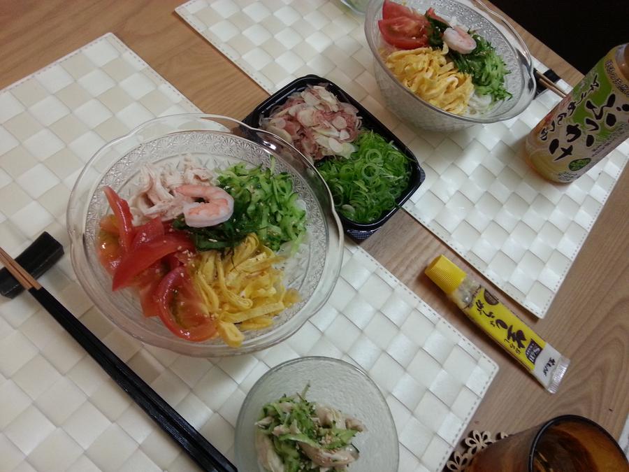 ぶっかけに、ちゃんと卵を焼いてくれました。すばらしい!!ふたりで5束食べました。僕が3、奥様2です、きっと。ぶっかけそうめんつゆが、近所のスーパーで安かったので、ぶっかけそうめんになったのだそうです。
