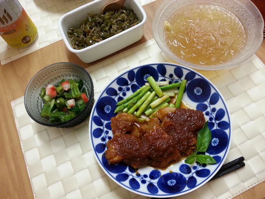 ポークケチャップ、見た目もいいね。バジルがオシャレです。アスパラガスは久々。「アレっ、こんな味だったっけ?」と思いましたが、ソースと一緒にガツガツ食べてしまいました。