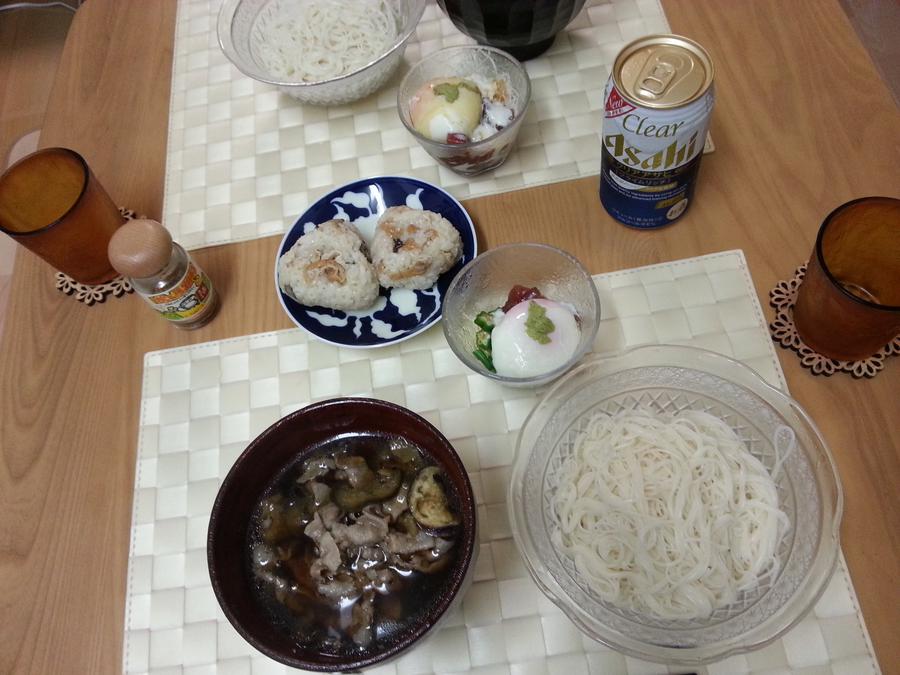 そうめんを、温かいツユでいただきました。冷たいものを沢山のむ季節なので、ナス&豚肉という具も相まって体に優しい美味しいご飯だぜ!。