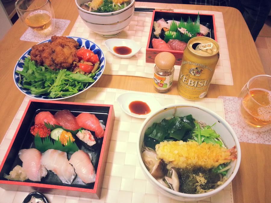 寿司は大丸で買ってきました。そば&チキンはサンプラザで、天ぷらはイオン。