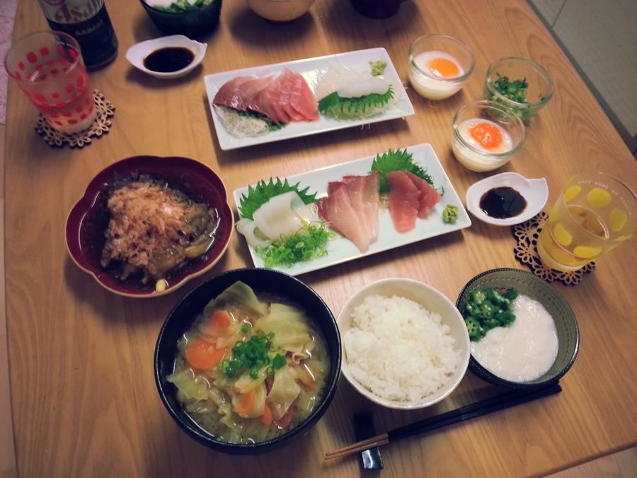 刺身はスーパーで悩んでいたら、店員さんが半額シールを貼ってくれたので、二舟買いました!