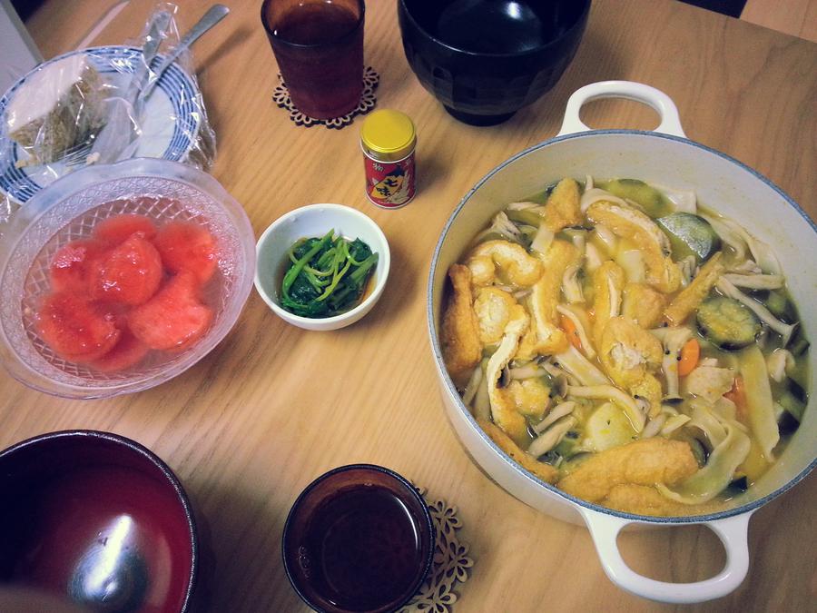 茄子、カボチャ、長いも、人参、しめじ、油揚げ、ちょっと鶏肉。野菜たっぷりです!