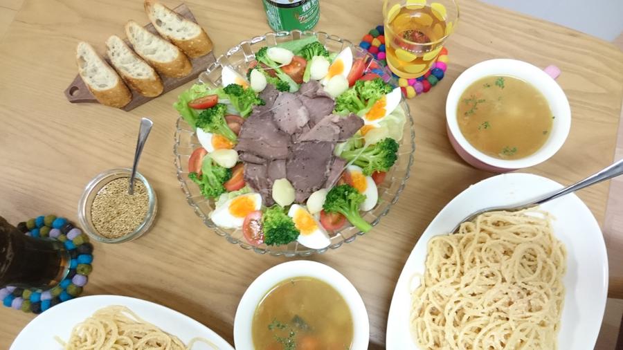 さて、晩御飯ですが、写真の中心がローストビーフサラダですねw。